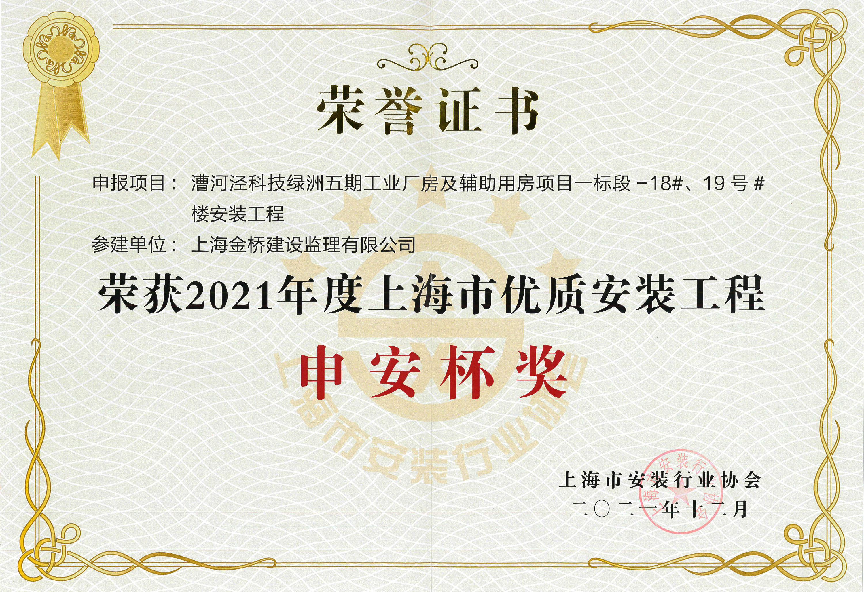 漕河泾科技绿洲五期工业厂房项目获上海市优质安装工程申安杯奖