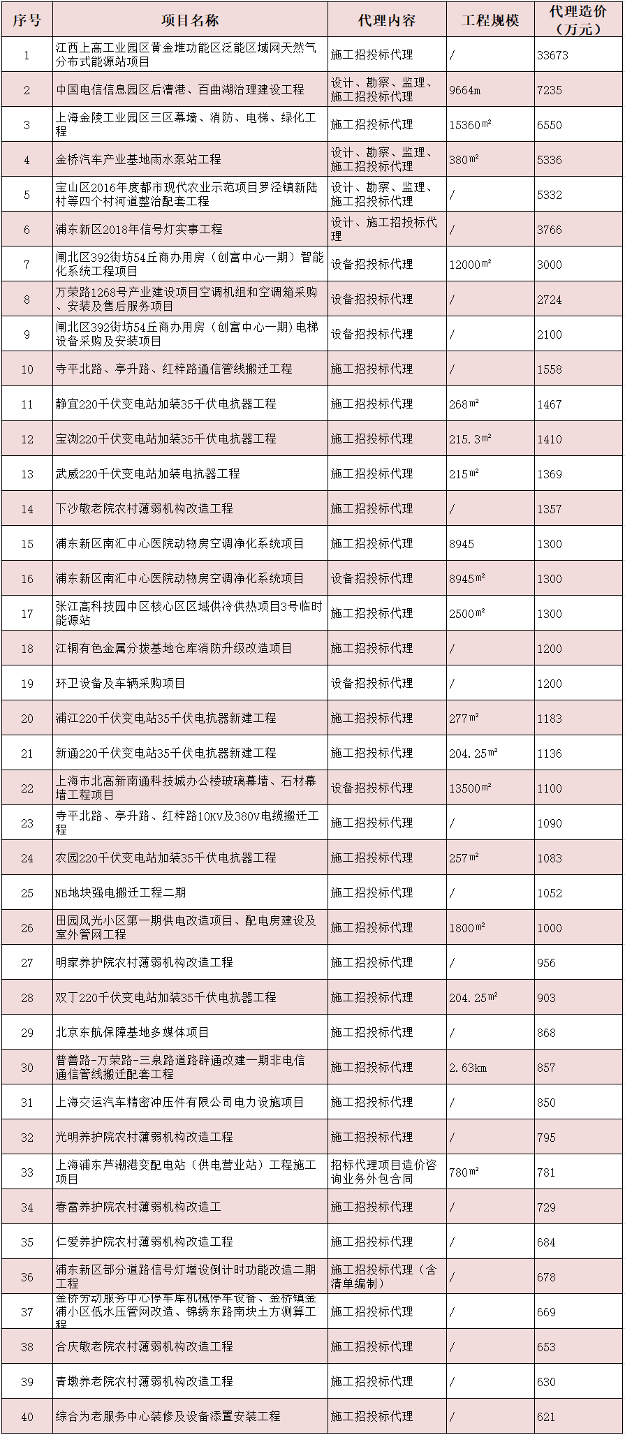 部分设备安装工程招标代理业绩一览表